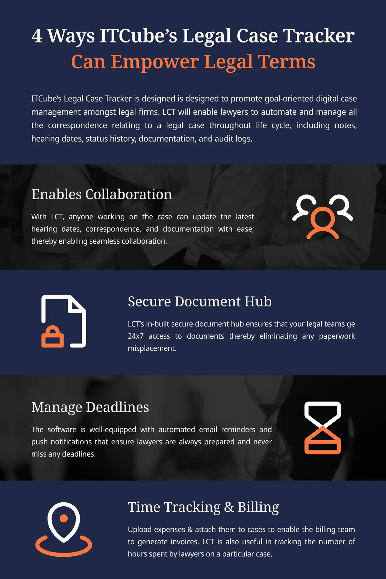 1Point1 is designed to promote goal-oriented digital case management amongst Legal firms. LCT will enable lawyers to automate and manage all the correspondence relating to a legal case throughout its life cycle, including notes, hearing dates, tasks, status history, documentation, and audit logs. Here are some reasons why LCT is the best legal case tracker!